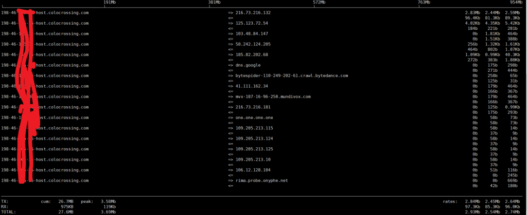 直接运行 iftop 命令即可开始监控第一个网络接口的带宽使用情况: